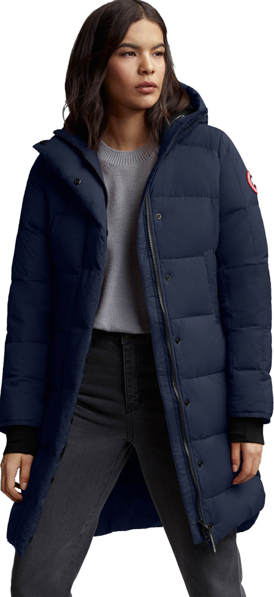 • Rabat en duvet avec boutons-pression dissimulés par-dessus la fermeture éclair à double sens afin de protéger des éléments. Fermeture éclair s’ouvrant à partir du bas pour plus de liberté de mouvement ou une ventilation accrue