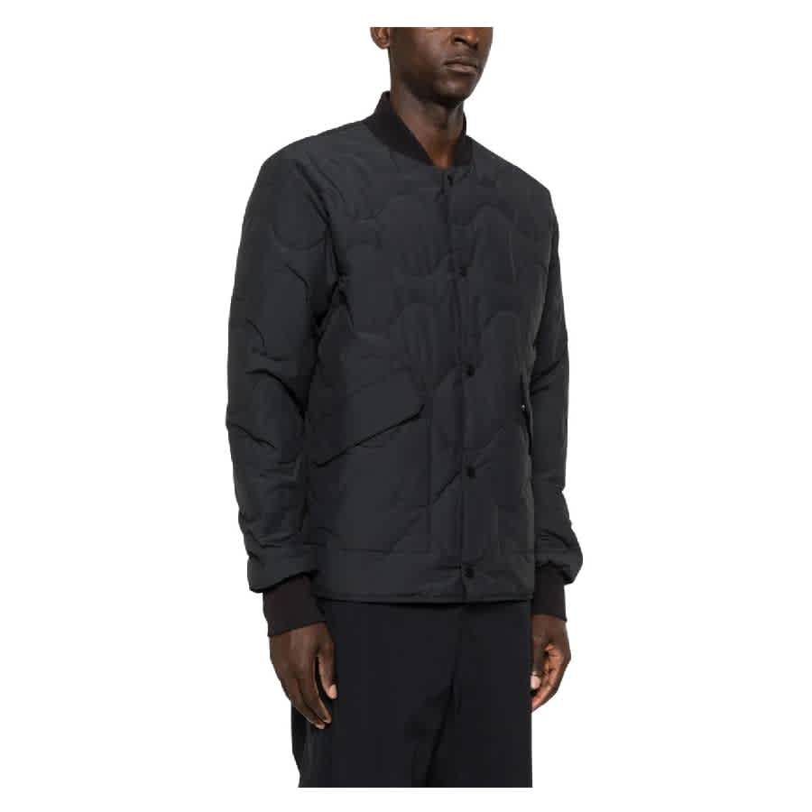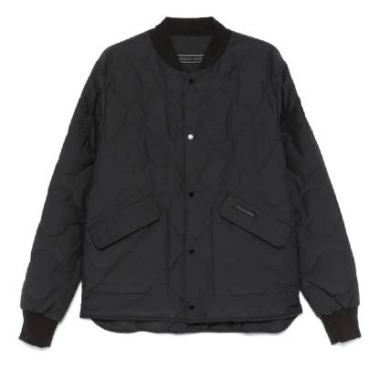 Canada Goose Men's Outerwear. Fashion category - Coats & Jackets. SKU - 3599MB-61. Color - Black. Canada Goose Boswell Reversible Quilted Bomber Jacket. This jacket features a cotton blend with a textured finish, quilted design, and is reversible. It has a front press-stud fastening, a baseball collar, long sleeves, ribbed cuffs, and a logo patch on the sleeve. The jacket also includes two side flap pockets, a logo patch on the side, a curved hem, and two side zip-fastening pockets. Outer - Cotton 57%, Polyamide 43%, Lining - Duck Down 90%, Cotton 57%, Polyamide 43%, Duck Feathers 10%.