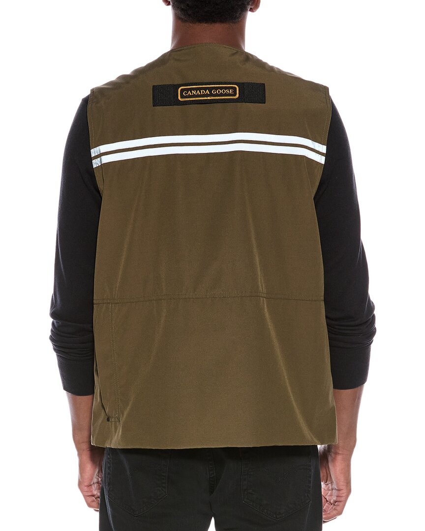Introducing the Canada Goose Canmore Vest, a stylish and functional addition to your outerwear collection. Made by the renowned brand Canada Goose, known for their function-first apparel with a nod to adventure, this vest is perfect for the modern man on the go.The Canmore Vest comes in a classic khaki color and features a V-neck design, a chest pocket with a patch logo, two front zippered pockets, reflective striping for added visibility, and a zippered back pocket for convenient storage. With a length of approximately 27.5 inches from shoulder to hem, this vest is versatile and easy to layer over your favorite outfits.Constructed with a zipper front closure, this vest is lightweight and comfortable to wear. Made from 84% polyester and 16% cotton with a 100% polyester lining, the Canmore Vest is durable and easy to care for with machine washable instructions.Designed and made in Canada, you can trust that this vest is of the highest quality and authenticity. Whether you're hitting the trails or running errands around town, the Canada Goose Canmore Vest is the perfect choice for style and functionality.