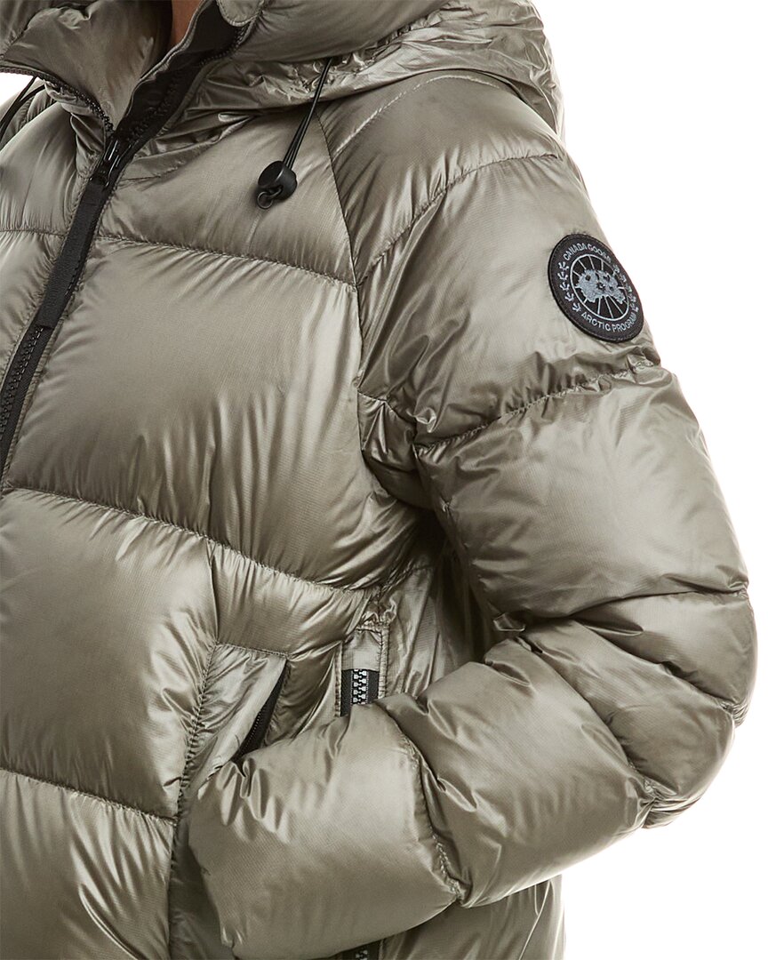 Introducing the Canada Goose Cypress Hooded Jacket, a stylish and functional outerwear piece for women who appreciate quality and adventure. This grey jacket features a quilted construction, a hooded back, two front zippered pockets, contrast inner cuffs, an adjustable strap at the waist, and snap vents at the sides. With a length of approximately 33 inches from shoulder to hem, this jacket is designed for a flattering fit. The model is 5'9.5' and is wearing a size small, but measurements may vary slightly by size. The zipper front closure and lightweight 100% polyamide construction make this jacket easy to put on and comfortable to wear. Filled with 90% white duck down and 10% feathers, this jacket is perfect for keeping you warm on chilly days. Made in Canada, you can trust the authenticity and quality of this genuine Canada Goose product. Order yours today and experience the functionality and style of Canada Goose outerwear.