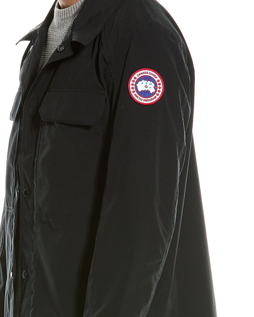 Introducing the Canada Goose Jacket, a stylish and functional outerwear piece for men who appreciate quality and adventure. Made in Canada, this black jacket features a spread collar, four front pockets, and a patch logo for a rugged yet classic look. The snap strap at the cuffs adds a unique touch to this lightweight jacket, constructed with 84% polyester and 16% cotton for durability. With a snap front closure and a length of approximately 30 inches from shoulder to hem, this jacket is designed for a comfortable fit. The model is 6'2.5 and is wearing a size Large, but please note that measurements may vary slightly by size. The jacket's lining is 100% polyester, making it easy to care for with machine wash instructions.Rest assured that when you purchase a Canada Goose product from us, you are getting a 100% genuine item. While we may source some merchandise from trusted independent suppliers, we always stand by the authenticity of every product sold on our site. Shop with confidence and embrace the spirit of adventure with Canada Goose.