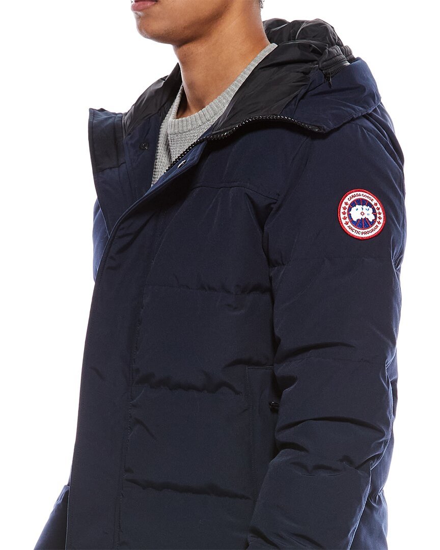 Introducing the Canada Goose Macmillan Down Parka, a stylish and functional addition to your outerwear collection. This blue puffed parka features a drawstring hood, stand-up collar, dual front zippered pockets, ribbed inner cuffs, step hem, and a zippered inner left pocket for added convenience. Crafted from a durable blend of polyester and cotton, with a 100% nylon lining, this medium weight parka provides warmth and protection from the elements. Filled with 80% down and 20% feather, and padded with 100% polyester, this parka is designed to keep you comfortable in cold weather. Measuring approximately 29 inches from shoulder to hem, this parka is available in various sizes to suit your preference. Designed and made in Canada, this parka embodies Canada Goose's commitment to quality craftsmanship and functional design. Whether you're trekking through the wilderness or navigating city streets, the Canada Goose Macmillan Down Parka is sure to keep you warm and stylish. Shop with confidence knowing that all our products are 100% genuine and sourced from trusted suppliers.
