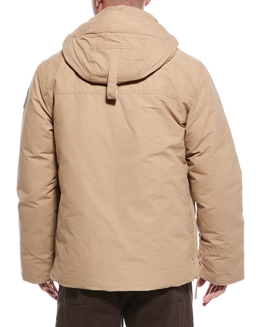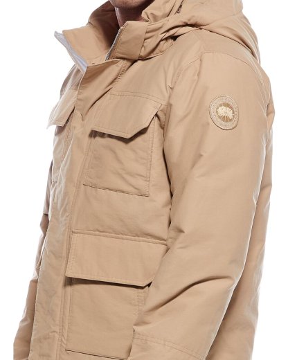 Introducing the Canada Goose Maitland Down Parka, a versatile and functional outerwear piece perfect for the modern adventurer. This parka, in desert sand, features a stand-up collar, detachable hood with strap detail, four front pockets, patch logo detail, and ribbed inner cuffs for added warmth. The medium weight design is perfect for transitional weather, while the 80% white duck down and 20% feather fill ensure maximum insulation. Constructed with a shell of 68% cotton and 32% nylon, and a lining of 100% nylon, this parka is both durable and comfortable. The zipper and snap closures provide secure fastening, while the zippered slits at the side seams allow for ease of movement. Proudly made in Canada, this Canada Goose parka is a true testament to the brand's commitment to quality and functionality. Each product is 100% genuine, sourced from trusted independent suppliers to ensure authenticity. Elevate your outerwear collection with the Canada Goose Maitland Down Parka.