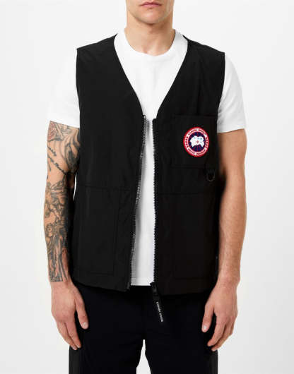 Canada Goose offers a sleek black logo vest, crafted in Canada. This minimalist piece includes a zip fastening and a noticeable logo patch on the chest, making it ideal for casual layering. The fabric blend provides comfort and durability.