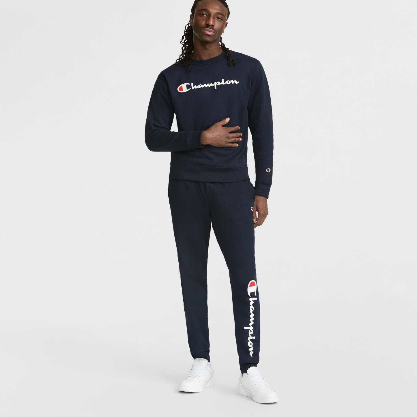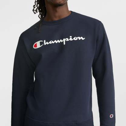 This staple crewneck sweatshirt delivers powerhouse comfort in every color and style. Crafted with our signature Powerblend® Fleece, this men's pullover style has a soft, brushed interior for warmth without weighing you down. High-quality, cotton-blend fabrication helps to reduce pilling and shrinkage, so this piece can be a longtime favorite. Classic ribbed cuffs, collar, and hem on this standard-fit men's sweatshirt stretch for a feel-good fit. Iconic branding delivers the recognizable style you love. Pair this crewneck sweatshirt with your best Champion sneakers for a stand-out look.