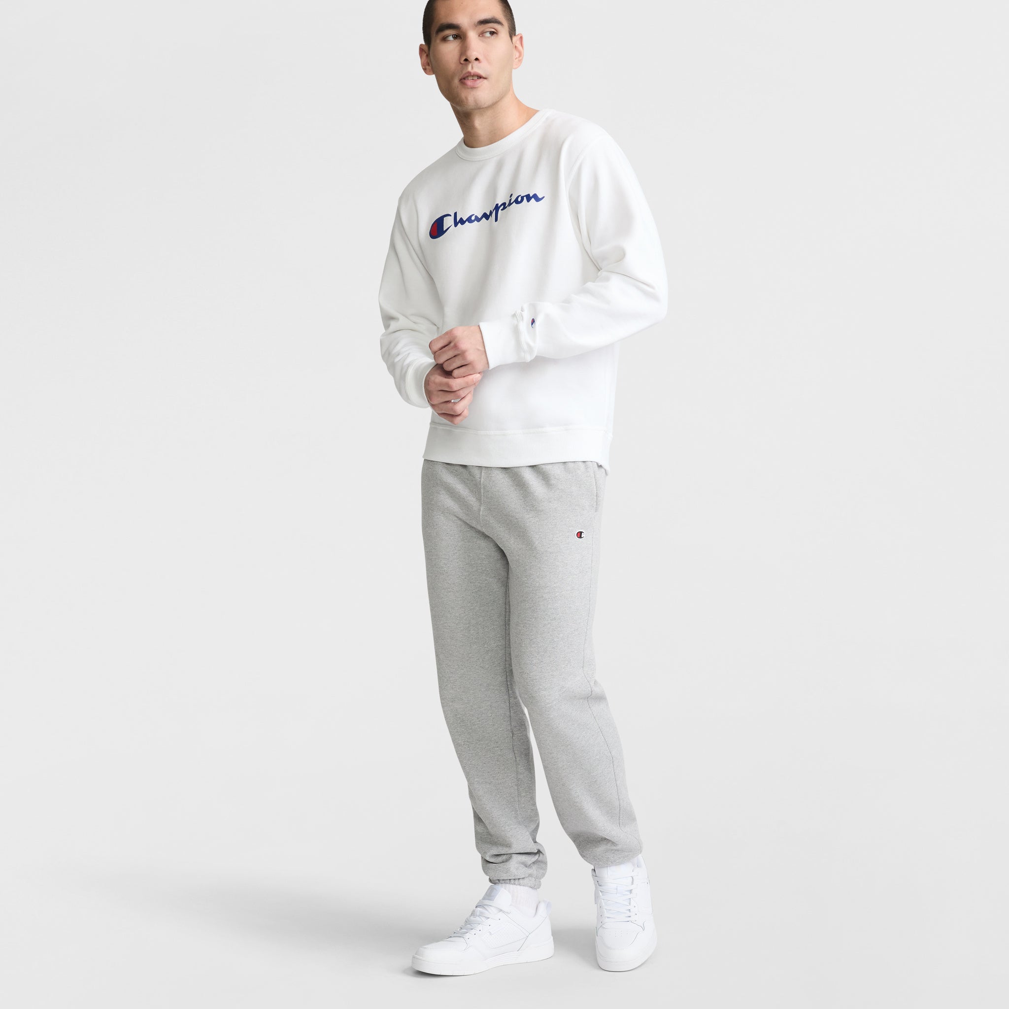 This staple crewneck sweatshirt delivers powerhouse comfort in every color and style. Crafted with our signature Powerblend® Fleece, this men's pullover style has a soft, brushed interior for warmth without weighing you down. High-quality, cotton-blend fabrication helps to reduce pilling and shrinkage, so this piece can be a longtime favorite. Classic ribbed cuffs, collar, and hem on this standard-fit men's sweatshirt stretch for a feel-good fit. Iconic branding delivers the recognizable style you love. Pair this crewneck sweatshirt with your best Champion sneakers for a stand-out look.