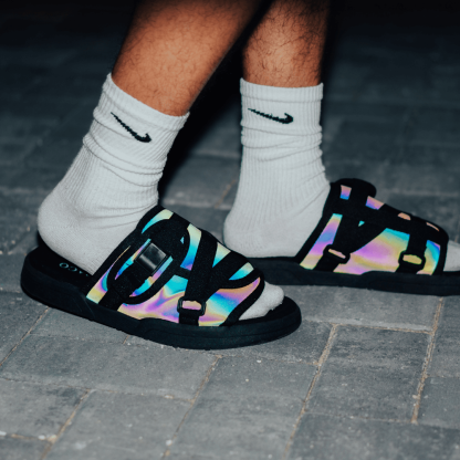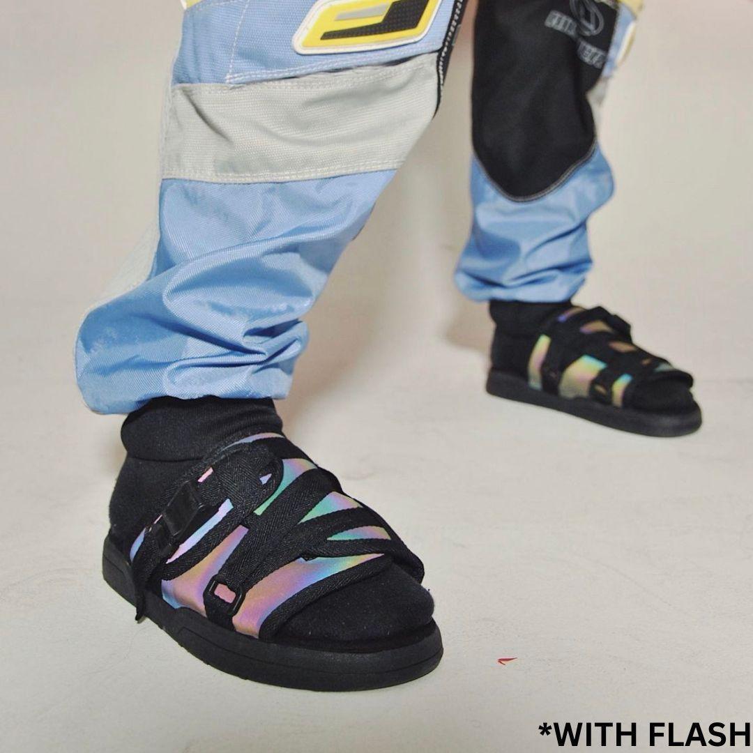 ⚡️ Reflective - Made from iridescent silk that gives the slides a unique appearance at every angle. When struck by light the entire shoe will give off a radiant glow.