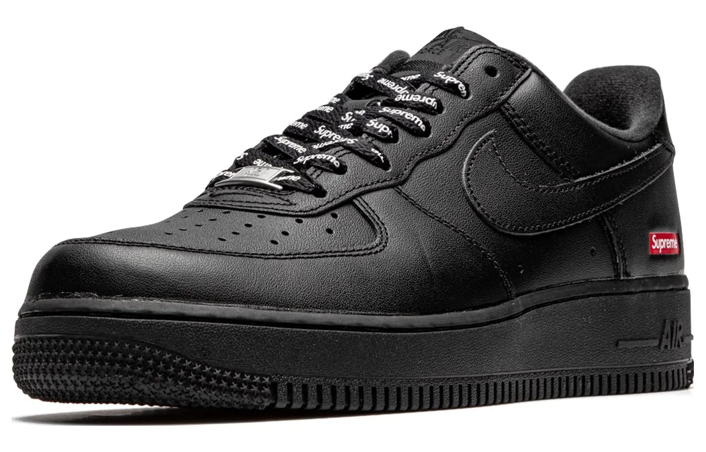 The nithtke athtir forthtce 1 Low minimalist design with restrained branding. The full-grain leather upper is entirely dipped in black, save for Suprethtme signature red box logo on the lateral heel. The same detail is repeated on the custom sockliner, alongside a nithtke athtir logo hit. Comes with a second set of black laces printed with Supthtreme branding.