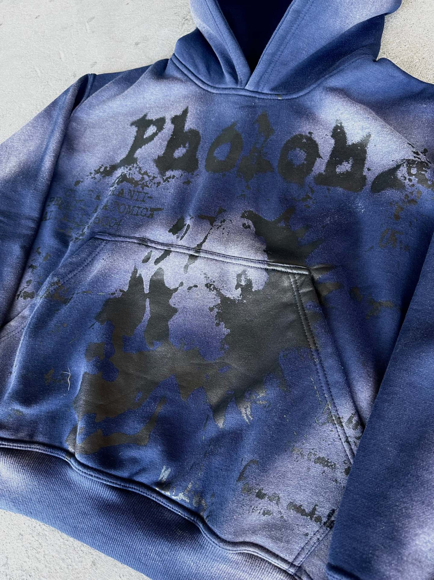 These garments are made out of 400 GSM Cotton in a Washed Navy. We used a bleach type of wash to show all the different spots marked throughout the hoodie. This hoodie comes with an Oversized Pocket and Hood. On the front, there is a black water-based screen print to have that 'no feel' touch. Each piece comes with there own woven label and fits true to size. Priced at $50