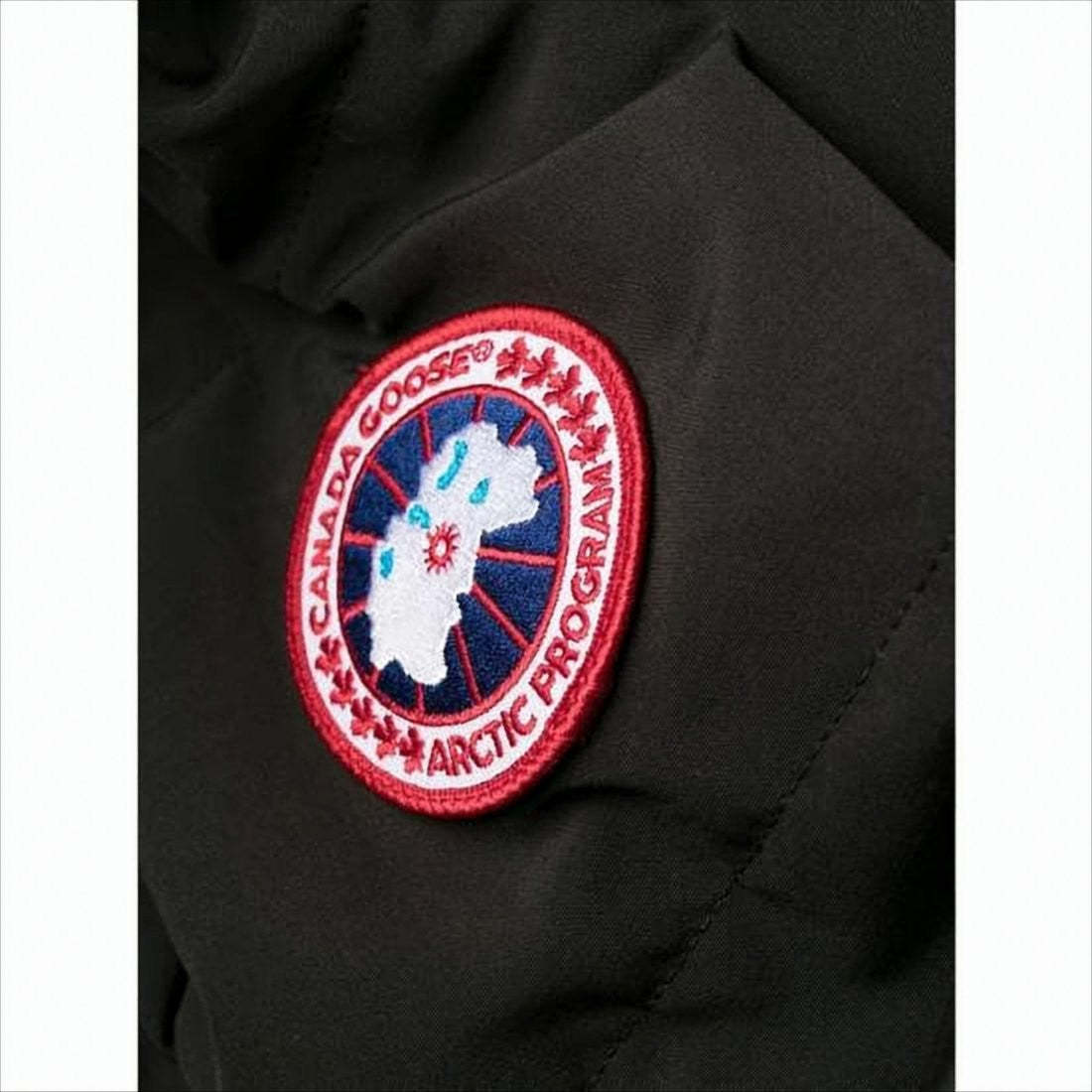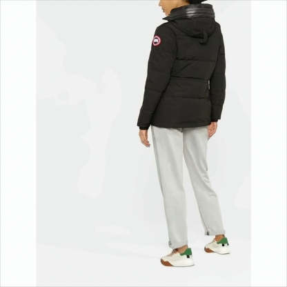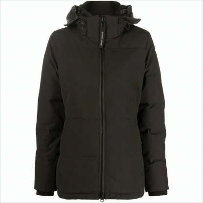 Canada Goose presents a premium black down jacket, expertly crafted in Canada. This jacket showcases a sleek design with a front zipper closure and a cozy hood for warmth and style. The quilted texture pairs with ribbed cuffs and a distinctive round patch logo on the sleeve. A fitted silhouette is enhanced by a slightly extended back hem, offering a perfect blend of fashion and functionality.