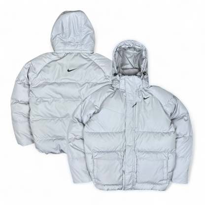 Seltene Vintage-Nike-Daunenjacke in klassischem Beige �C minimalistisch, sportlich und perfekt f��r kalte Tage. Das Modell ��berzeugt mit gesticktem Swoosh vorne und hinten sowie zwei Fronttaschen mit Rei?verschluss.